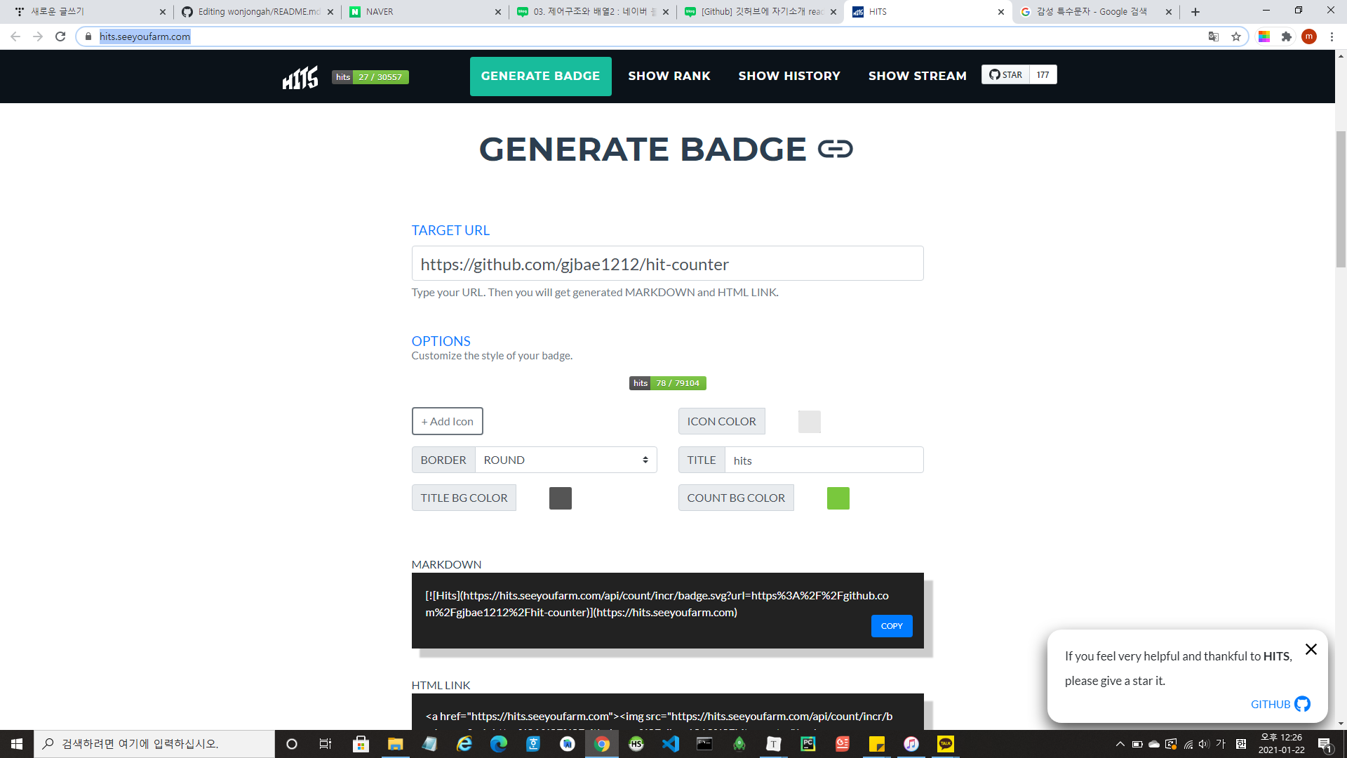 < 방문자 Hits 뱃지 달기 >